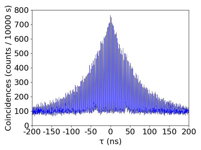 私達は、光ファイバー中を低損失で伝送することが可能な通信波長において開発に取組み、世界最小線幅(~1MHz)の量子メモリと高効率結合可能な量子もつれ光子対源を実現しました。図は、開発2光子源の出力である2光子間の時間差測定結果です。包絡線の減衰から線幅を評価することができ、また全体のカウント数からスペクトル輝度を求めることができます。